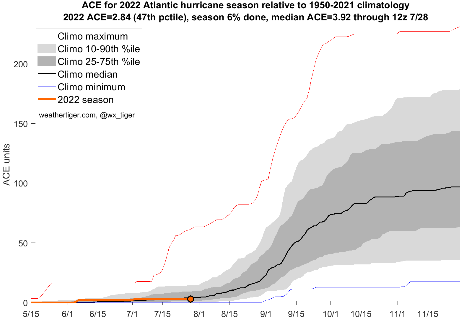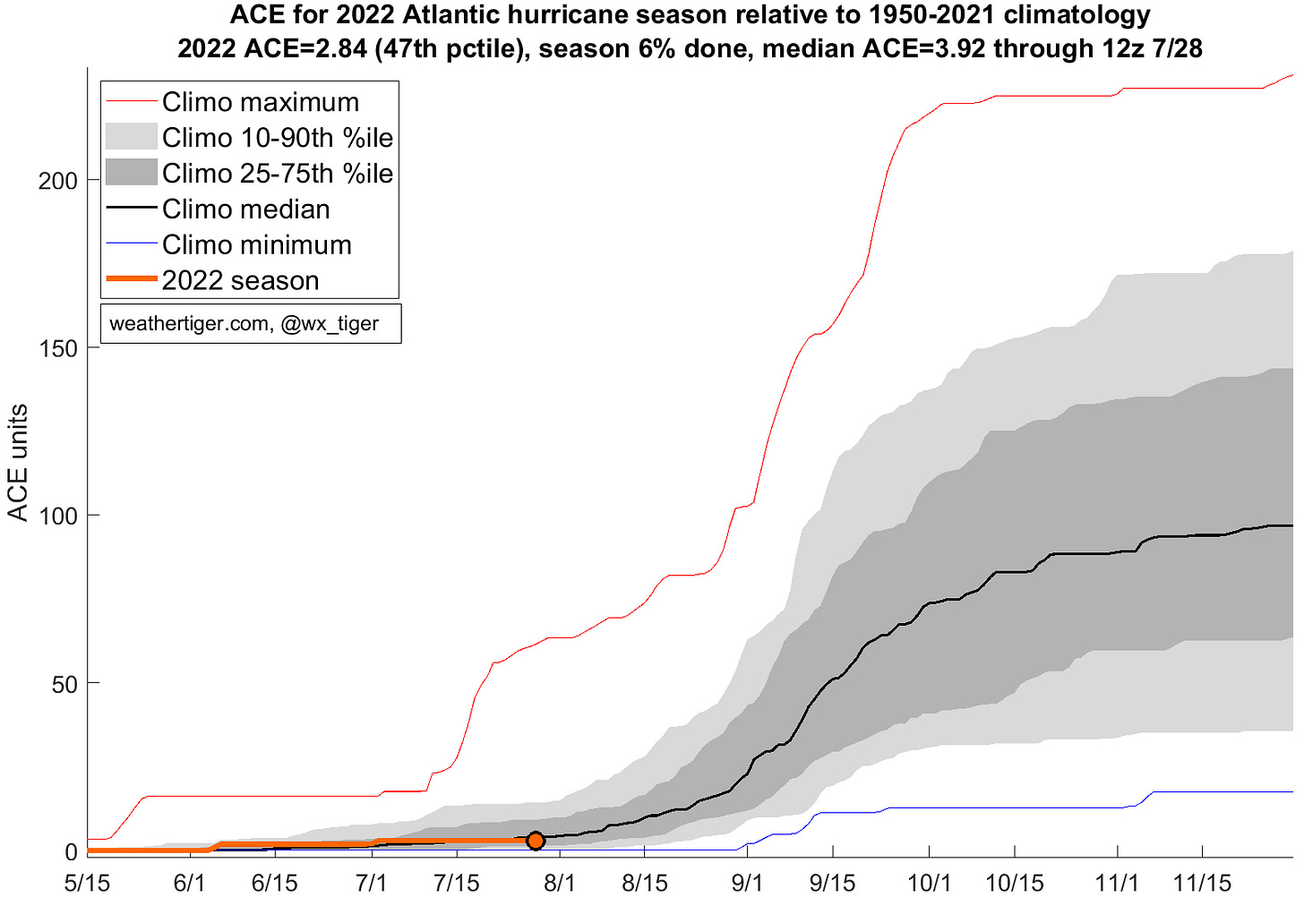 Almanac: It’s Thursday, July 28th… day 58 of the 2022 hurricane season, 125 days to go. By total storm energy, the season is 6.3%, 15%, and 9.2% complete for the Atlantic, continental U.S., and Florida, respectively.