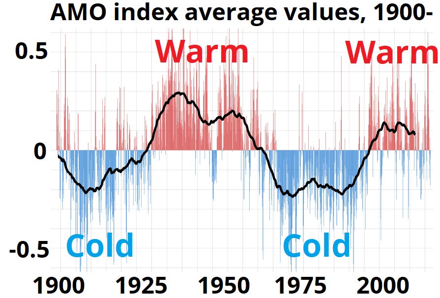 This is important, because hurricane history shows that Atlantic SSTs are the master of spin for entire generations of storm activity. While conditions vary from year to year, there is also a 20-to-40-year cycle of warming and cooling of Tropical Atlantic waters called the Atlantic Multidecadal Oscillation (AMO).
