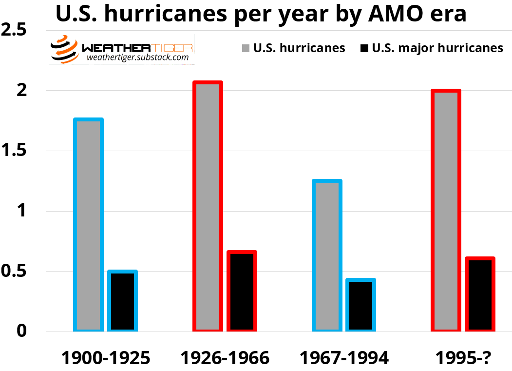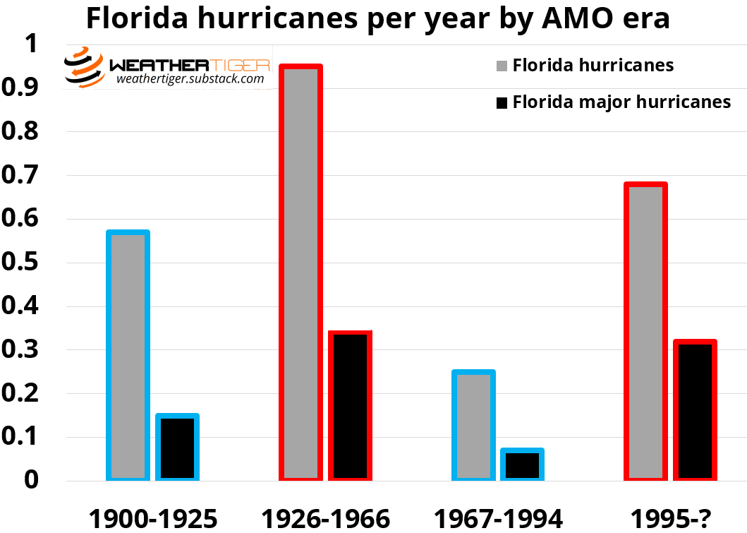 When the AMO is negative, the Atlantic is cooler than average, and there are fewer landfalls compared to when everything has changed and the Atlantic is warm. The influence of AMO cycles is particularly pronounced in Florida, where hurricane landfalls are twice as common and major hurricane landfalls three times as frequent in warm versus cool AMO phases. Activity jumps, then falls. It’s really something.