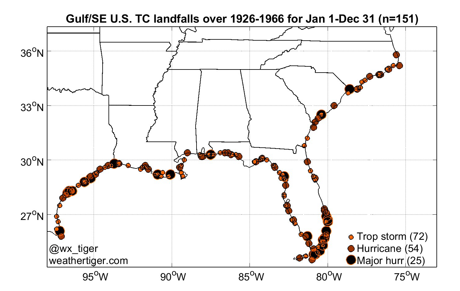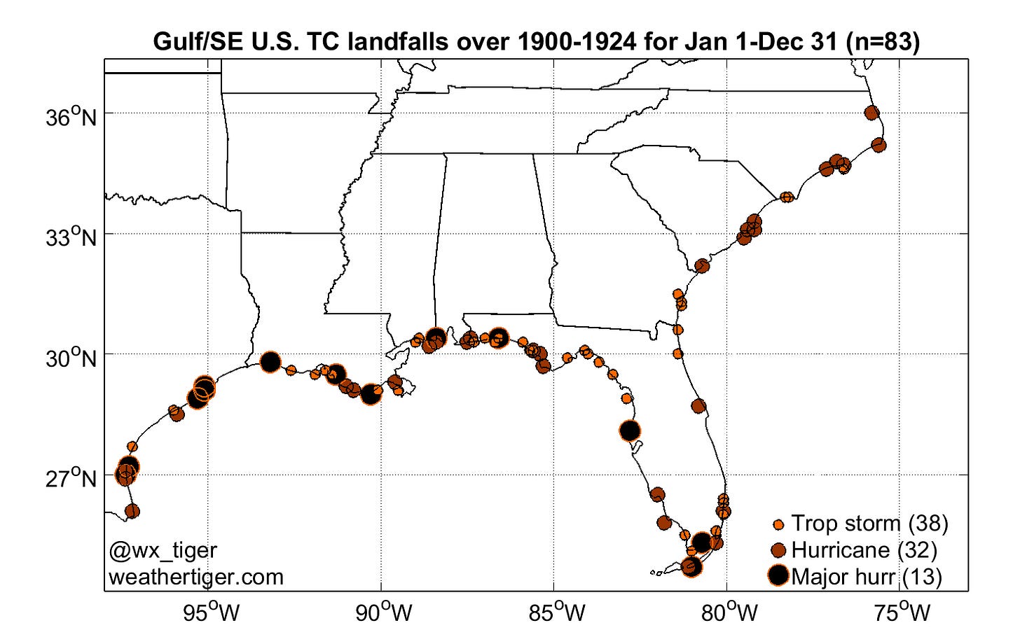 Climatology is a little spotty in the early 20th Century; there were probably more storms than meteorologists know about, but we just can’t prove it. However, enough people lived in saltbox houses on the coast to have a reasonably complete record of U.S. landfalls in the 1900s and 1910s. We’re confident that the Atlantic was cool and these years were generally quiet, with some exceptions like the 1900 Galveston hurricane. Still, there were only two U.S. category 4 hurricane landfalls between 1901 and 1925. Florida saw just four category 3+ landfalls, none of which ever, ever, ever struck the rapidly developing East Coast. Next chapter.