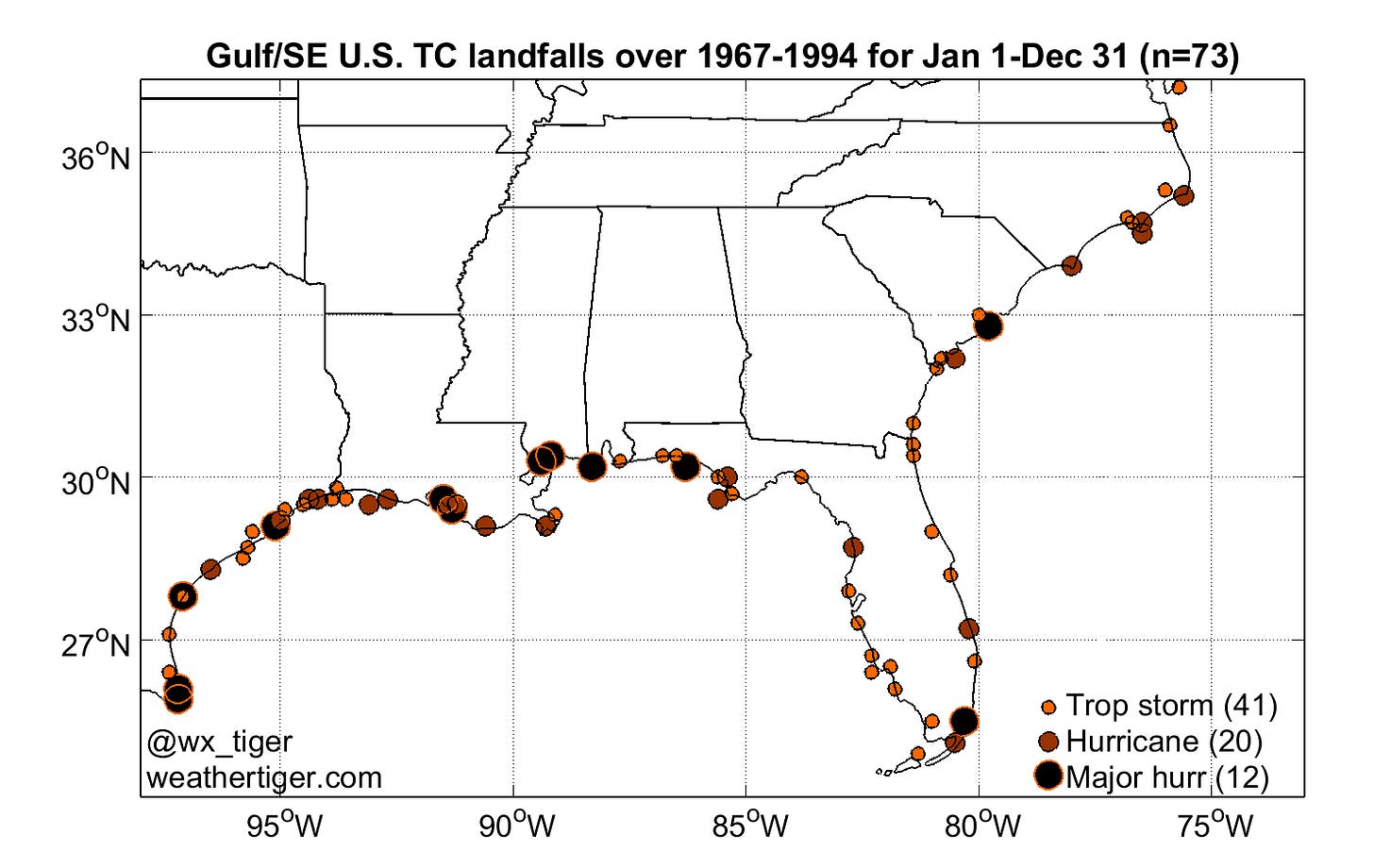 And then in the late 1960s, warm AMO couldn’t come to the phone, because it was dead. A cold phase with even cooler anomalies than 1900-1925 dominated the Atlantic for almost 30 years, and U.S. hurricane landfall frequency dropped by 40%. In Florida, we just about forgot that hurricanes existed: there were only seven hurricane and two major hurricane landfalls (unfortunately, Category 5 Andrew among them) in 28 years. Still, that is as rare as the glimmer of a comet in the sky in historical terms. For most of Florida, let me tell you now, we were the lucky ones.