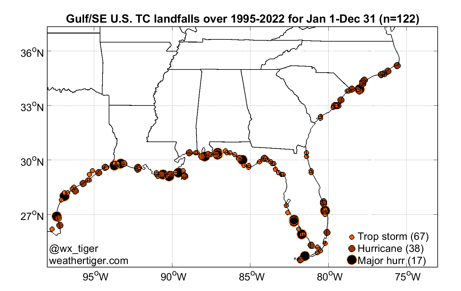 That slope was treacherous. Average U.S. hurricane landfall frequency returned all too well to the previous highs of around two per season, eventually bringing some of worst landfalls on record: Katrina, Sandy, Harvey, and Maria. In Florida, there have been nine major hurricanes in the last 28 years, mostly in the mid-2000s and since 2017, and mostly along the Gulf Coast: Charley, Ivan, Irma, Michael, Ian, and others. Note that compared to the 1926-1966 warm AMO, the landfall map in South Florida is suspiciously blank space.
