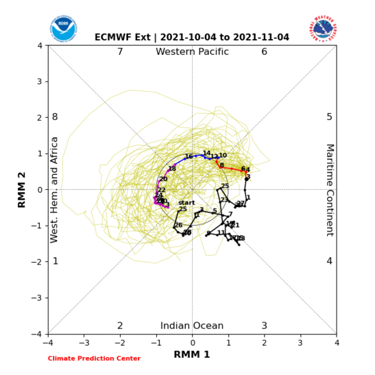 Otherwise, the Atlantic is quiet with no likely candidates for development out there. This is typical of ongoing phases 5 and 6 of the Madden-Julian Oscillation (MJO), a global pattern of winds aloft influencing the location and extent of tropical convection. Ceteris paribus, the suppressed MJO phases, 5 through 7, tend to mean more shear and convergent winds in the upper atmosphere over the western Atlantic, which are unfavorable for storm development.