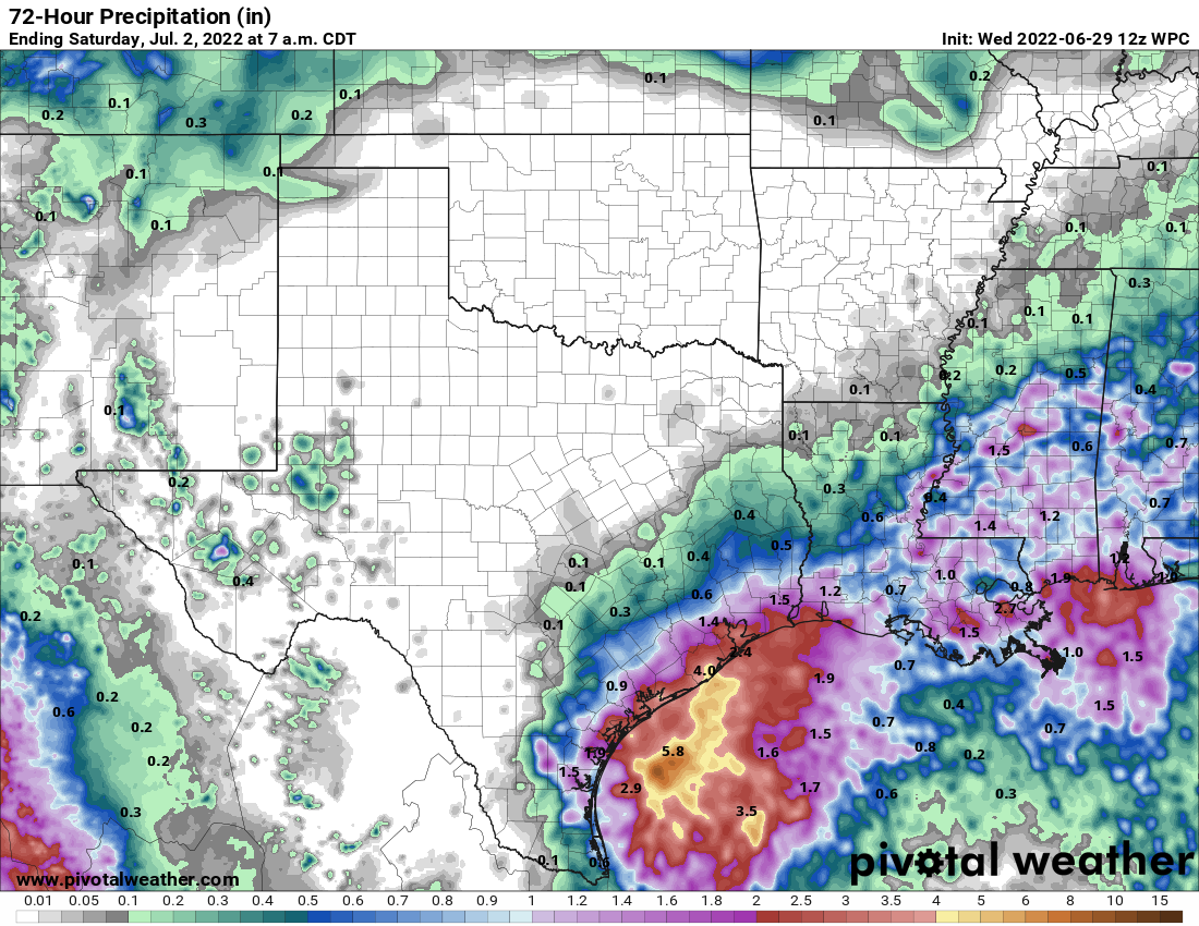 Also of interest for the Gulf Coast is Invest 95L, a clutch of storms off the Texas coast. Convection is a little more concentrated today around a weak surface circulation east of Brownsville, and there is some chance that a tropical depression forms before the system drifts inland near Corpus Christi on Thursday. A marginal environment and loose structure should preclude significant non-rainfall impacts, though 1-3” rain totals are possible in coastal Texas into the weekend as 95L slides north.