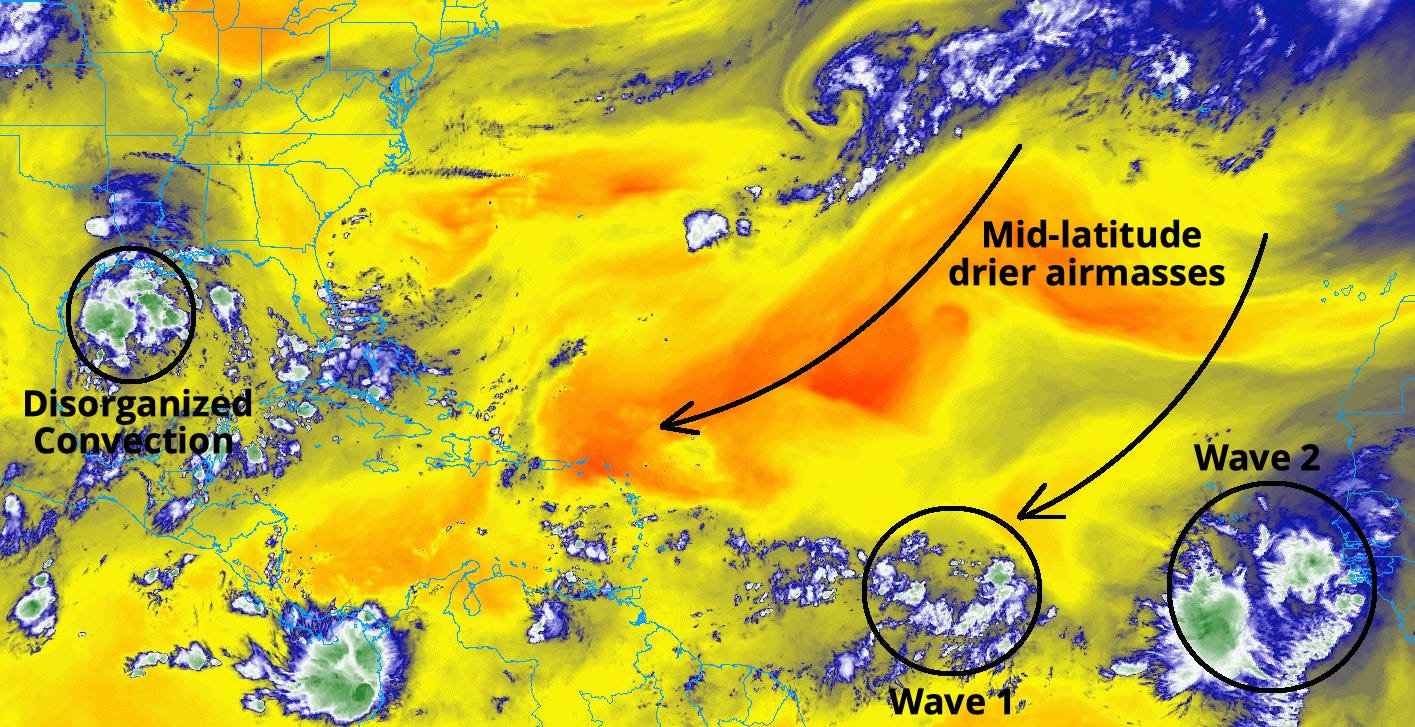 That means rather than smoothly rolling off the coast and proceeding west, farther north waves have gotten tangled up in powerful West African monsoon winds, smearing out their initial rotation and preventing eventual development. Their northward displacement also means waves emerge over cooler waters and closer to the unfavorable influences of mid-latitude weather, bringing us to our final suspect.