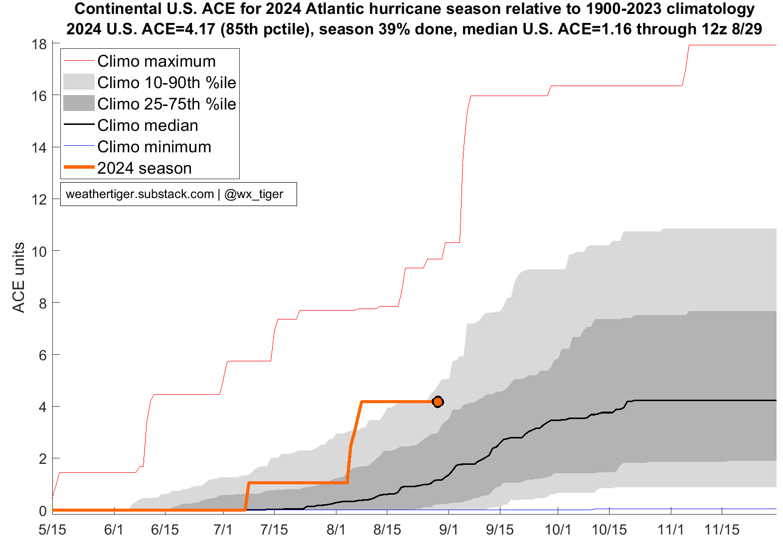 Could the Atlantic defy the odds and stay quiet in September? It’s possible, but I doubt it. If so, we should be thankful for the rare win. Maybe I’ll do the Will Shortz crosswords that have been sitting on my nightstand for 8 years, or learn to play the banjo instead of just owning a banjo. But keep in mind the climatological frequency of hurricane and major hurricane landfalls in Florida is essentially constant between late August and late October. Around 75% of Florida’s historical storm activity is still ahead, and only a fool would place a bet on the winds blowing fair for all of it. Keep watching the skies, though I won’t blame you for taking off Labor Day 2024.