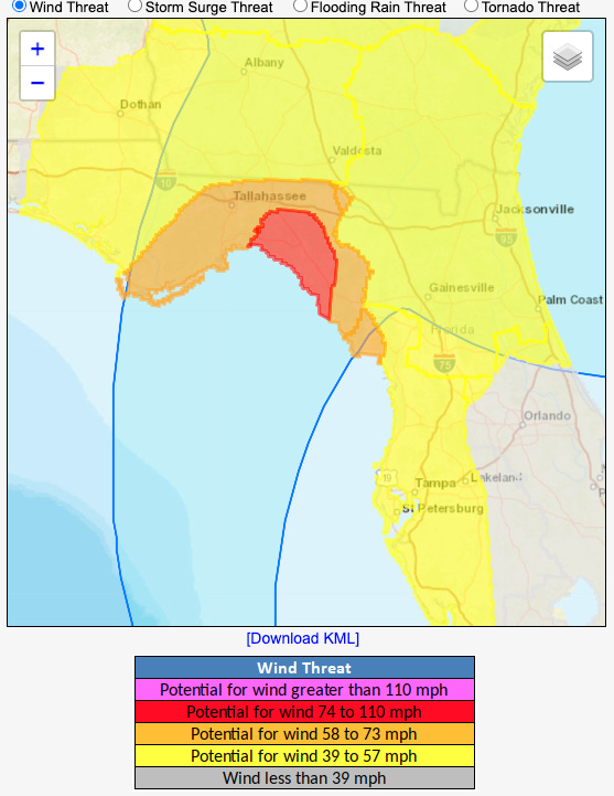 In Apalachee Bay, the threat is more conditional; as in Idalia, surge will be highest at 4-7’ along and just east of where the eyewall tracks, with little or no surge west of the center with offshore winds. The eastern half of Apalachee Bay is more likely to get those peak surge values, but you need to be preparing for destructive surge in western Apalachee Bay as well, even though it is less likely to actually occur. As always, monitor (and heed!) evacuation guidance from your county’s local emergency management office.