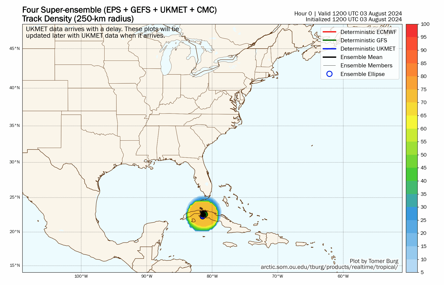 As of the 5 p.m. Saturday NHC advisory, Debby is located about 100 miles southwest of Key West, with sustained winds up to 40 mph. The storm is now moving northwest at about 15 mph, following a path that has bent more northwestward today as Debby connects with an eastern U.S. dip in the jet stream. With Debby’s circulation consolidating farther southwest than yesterday’s NHC forecasts suggested, the most likely path of the center has also shifted west, away from Florida’s Nature Coast and towards the eastern Panhandle over the last 24 hours.