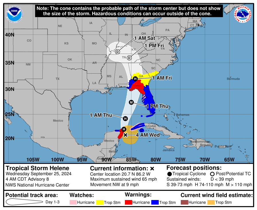 Helene has intensified to a strong tropical storm this morning while moving towards the southern Gulf of Mexico, and its expected path has shifted slightly west overnight. NHC track and intensity forecasts have changed only slightly overnight, bringing a major hurricane into the eastern Panhandle tomorrow evening. With the onset of widespread dangerous condition early tomorrow, you have today to prepare for what will be an unprecedentedly large and powerful hurricane strike on North Florida with severe impacts occurring all along the Florida Gulf Coast, where Hurricane and Storm Surge Warnings remain in effect. (See cone below for wind warnings.)