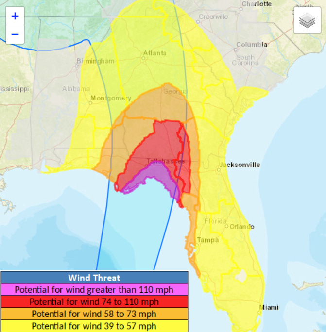 As far as wind impacts go, the difference between damaging and potentially catastrophic winds for your local impact is whether or not the core/eyewall of Helene moves over you, which in this case may be 60 miles wide or so, narrowing inland though not particularly quickly due to Helene’s expected 20 mph+ forward speed on impact. It’s too early to know exactly who will get the core, but if you do, expect damaging inland wind gusts of 80-100+ mph. For Tallahassee, that would cause damage exceeding Hermine or Michael. On the coast, that’s where the NWS wind threat product below is showing the highest potential of major hurricane (111 mph or higher) gusts. Right now, it’s not looking great for Tallahassee and the Big Bend, as we’re running out of time for the kind of bacon-saving east shift that kept the worst of Idalia and Debby to our southeast. Damaging winds will also extend well inland into south Georgia and south along the Florida Gulf Coast, as shown below.