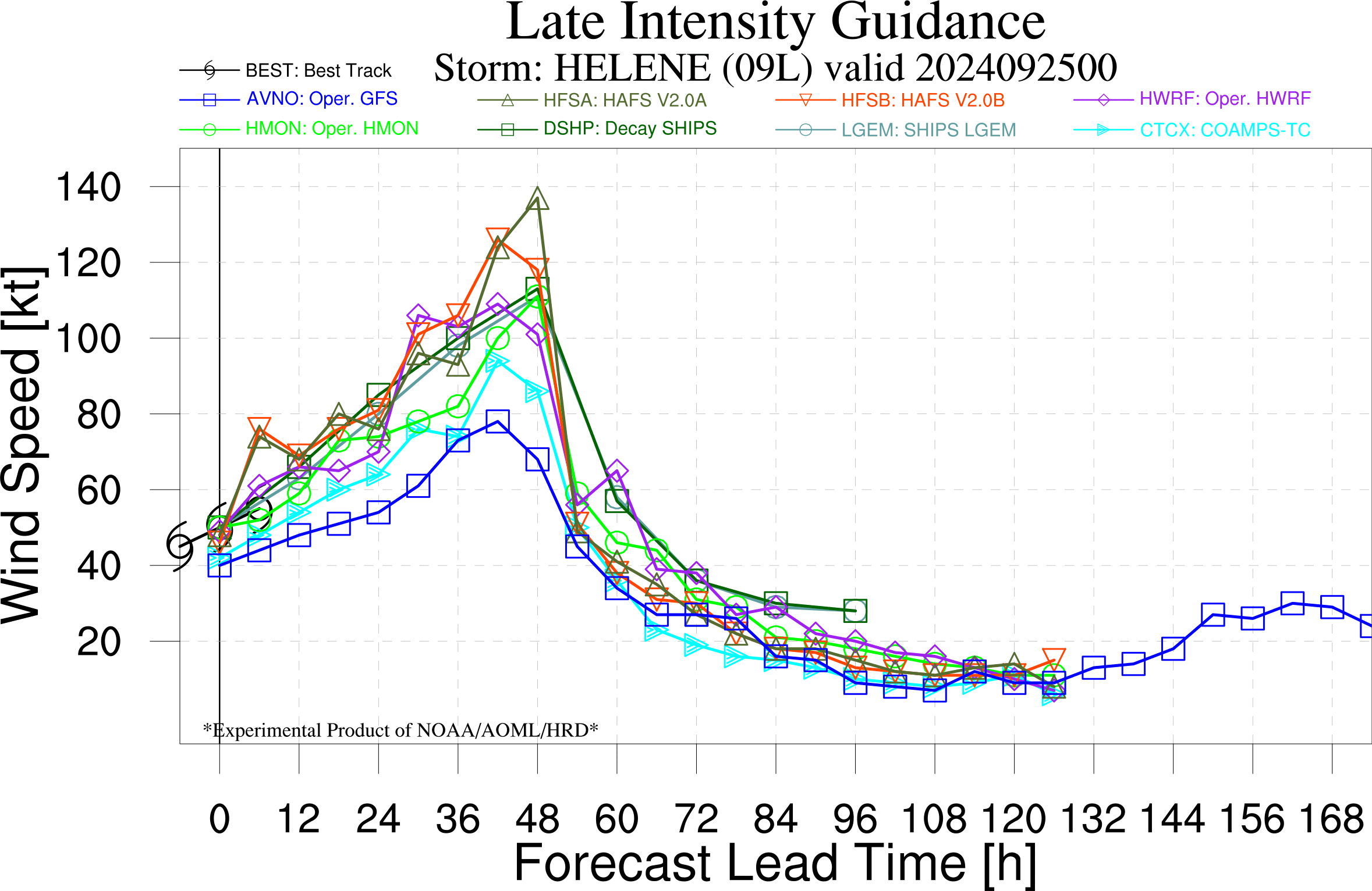 Maximum sustained winds have increased to 65 mph overnight, so Helene is on the cusp of Category 1 hurricane intensity. Two Hurricane Hunter planes are enroute to check Helene’s intensity and structure, and we haven’t had fresh aircraft obs for a few hours. Deep convection has wrapped around the center overnight, and everything I’m seeing this morning on satellite and radar suggests the storm is strengthening, if not rapidly for now, at least steadily. We’ll see if the Hurricane Hunters find that Helene is a hurricane later this morning. In the meantime, NHC intensity forecast continues to call for Helene to intensify to a Category 3 hurricane by Thursday morning, and maintain that intensity to landfall. Peak intensity at Category 4 strength remains a possibility indicated by the HAFS hurricane models. In general, Category 2 to 4 strength at landfall remains probable, though as I’ve mentioned before, “category” is a misleading way to think about Helene and its myriad threats.