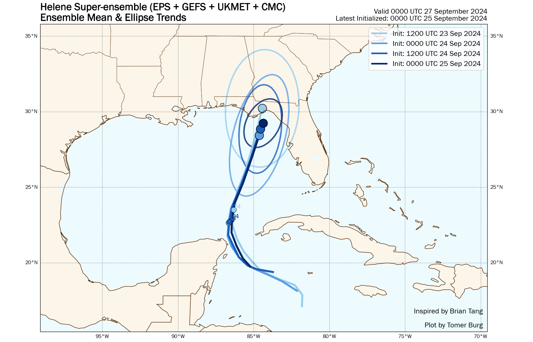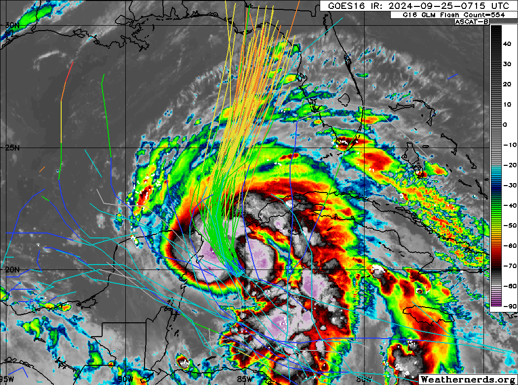 Overall, this is a bad trend for everyone in Florida, but especially the eastern Panhandle and Big Bend. With Helene following model and NHC guidance closely overnight (see infrared/GEFS tracks overlay below), avoiding land interaction, and appearing structurally poised for intensification, catastrophic storm surge as well as destructive winds are increasingly likely in the areas under Hurricane and Storm Surge Warnings. With only some widely scattered storms expected in Florida on Wednesday, weather will be generally good for preparations and evacuation, as your situation requires. IF YOU HAVE AN EVACUATION ORDER, GO TODAY. Weather conditions will go downhill tomorrow.