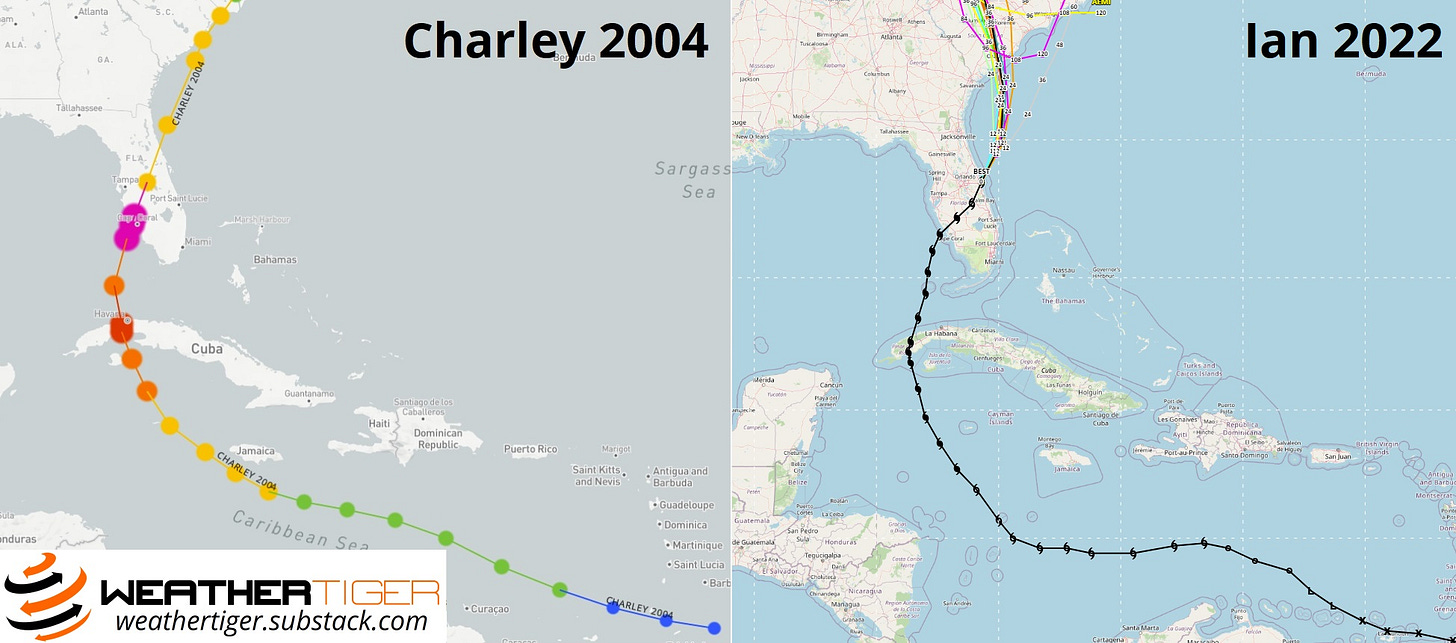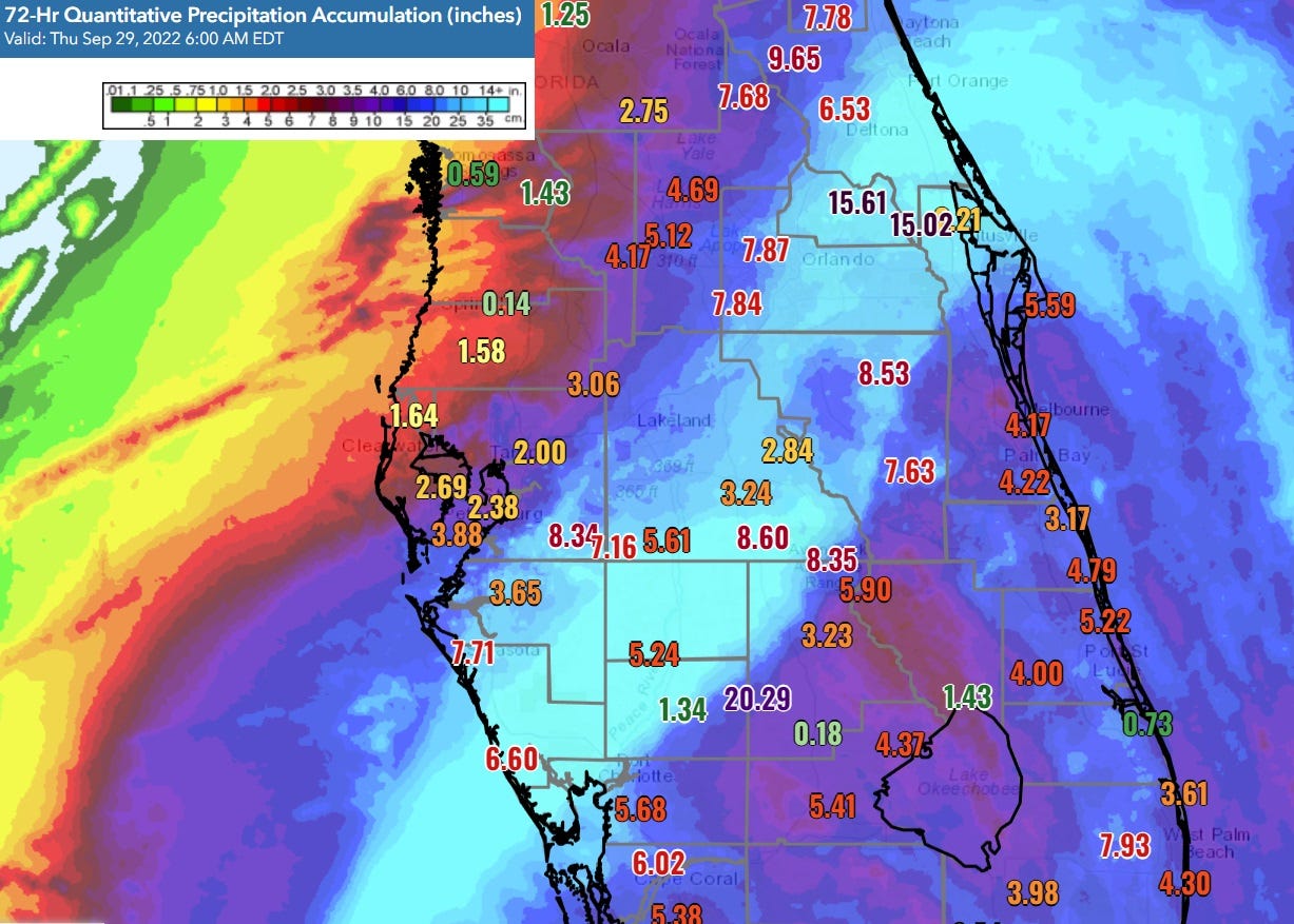 In short, serious and significant impacts are continuing in Florida through Thursday, but should end in the state and be replaced by fair weather for recovery efforts by Friday. Unfortunately, Ian has met or exceeded all or most of the forecast benchmarks of wind, surge, rainfall impacts laid out prior to landfall. While Hurricanes Ian and Charley share a landfall point, maximum wind speed, and pressure, Ian’s larger size and slower movement elevate its surge and rainfall impacts well beyond Charley, both in absolute maximum terms and geographical scope of impacts. Conversely, Ian’s maximum winds across east Central Florida were thankfully lower than Charley’s.