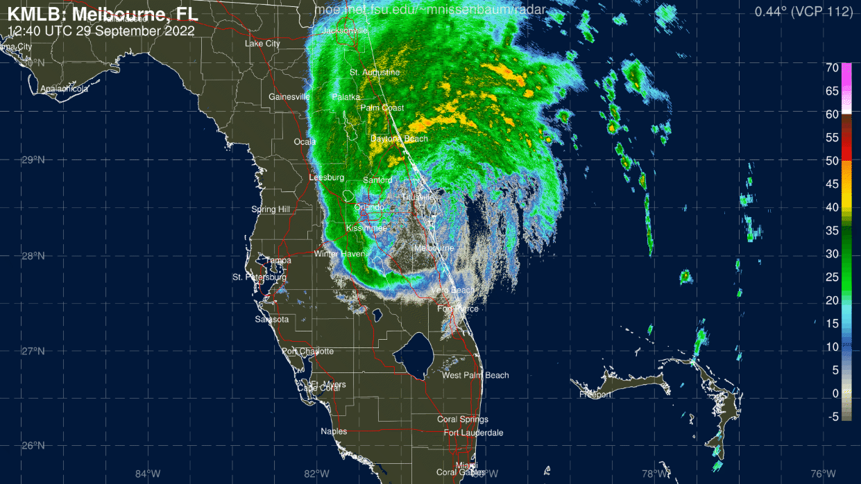 As of the intermediate advisory issued by the NHC at 8 a.m., Tropical Storm Ian is located about 40 miles east of Orlando and very close to Cape Canaveral, moving northeast at about 8 mph. Ian moved a little more eastward than forecast after landfall, thus reaching the Atlantic Coast faster than anticipated, and will be back over water through Friday afternoon.