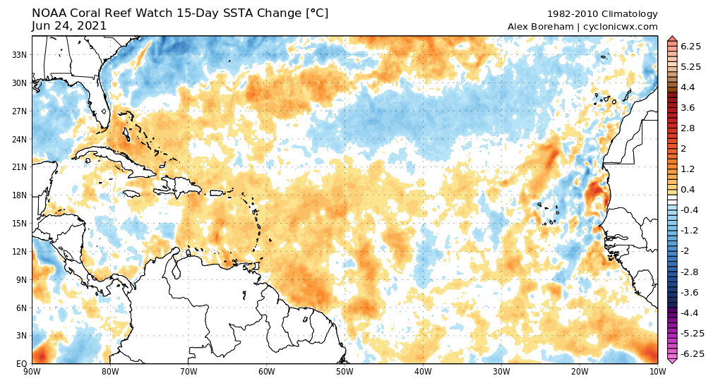 Overall, the most alarming aspect of these waves is that needing to watch the eastern Atlantic in summer is an ill portent. Years with early Main Development Region storms, like 1933, 1979, 1996, 2005, or 2017, tend to continue active through the peak season. This year also is poised to follow the tendency of the past five in notably warming the eastern Atlantic relative to normal in summer (above). If those trends continue for the season’s climatological peak in August and September, much like a goose blocking the sidewalk, it’s not clear how we get around it without feathers flying. Keep watching the skies.