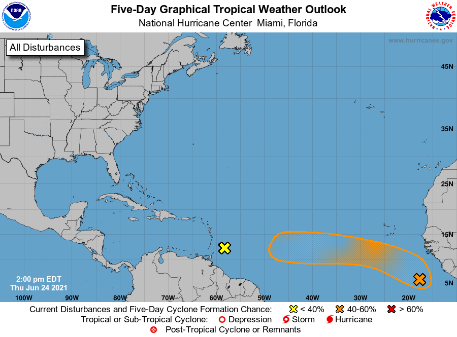 The key word there is usually, because the regions to watch in the Atlantic are located well east of the typical regions for potential storm development in late June: two tropical waves traversing the Main Development Region between the Lesser Antilles and west Africa. The first of these, a wave moving through the Windward Islands, made a brief run at spinning up a few days ago, but is now embedded in a region of strong wind shear over the eastern Caribbean. This shear will make tropical development of this wave impossible in the week ahead.