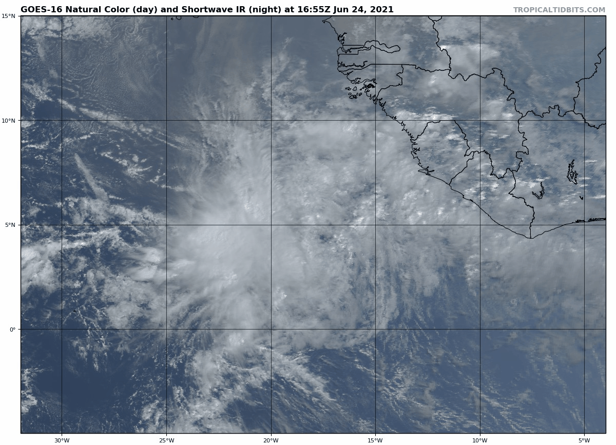 Despite these climatological headwinds, this wave has a puncher’s chance of further organization. Convection is extensive near an area of low-level rotation, with rising motion driven by oddly favorable upper-level outflow. Tepid ocean temperatures usually inhibit development in the eastern Atlantic prior to late July, but in this case the disturbance is far enough south that the waters are warm enough to support slow organization.