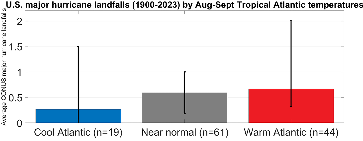 With the link between overall activity and U.S. landfalls weaker than you’d think, pivoting to an impacts focus allows a more nuanced approach to key outlook predictors. For instance, while La Nina events tend to favor both more U.S. landfalls and more overall activity (and El Nino events the opposite), the relationship between Atlantic sea surface temperatures and landfall risks is less intuitive. Abnormally warm ocean temperatures in the Atlantic’s Main Development Region from Central America to West Africa typically mean more overall activity, but not necessary more U.S. landfalls. Very cool years do see fewer U.S. landfalls, but there’s not much difference in how many major hurricanes strike between years in which the Tropical Atlantic is close to normal and years in which it is notably warmer than normal.