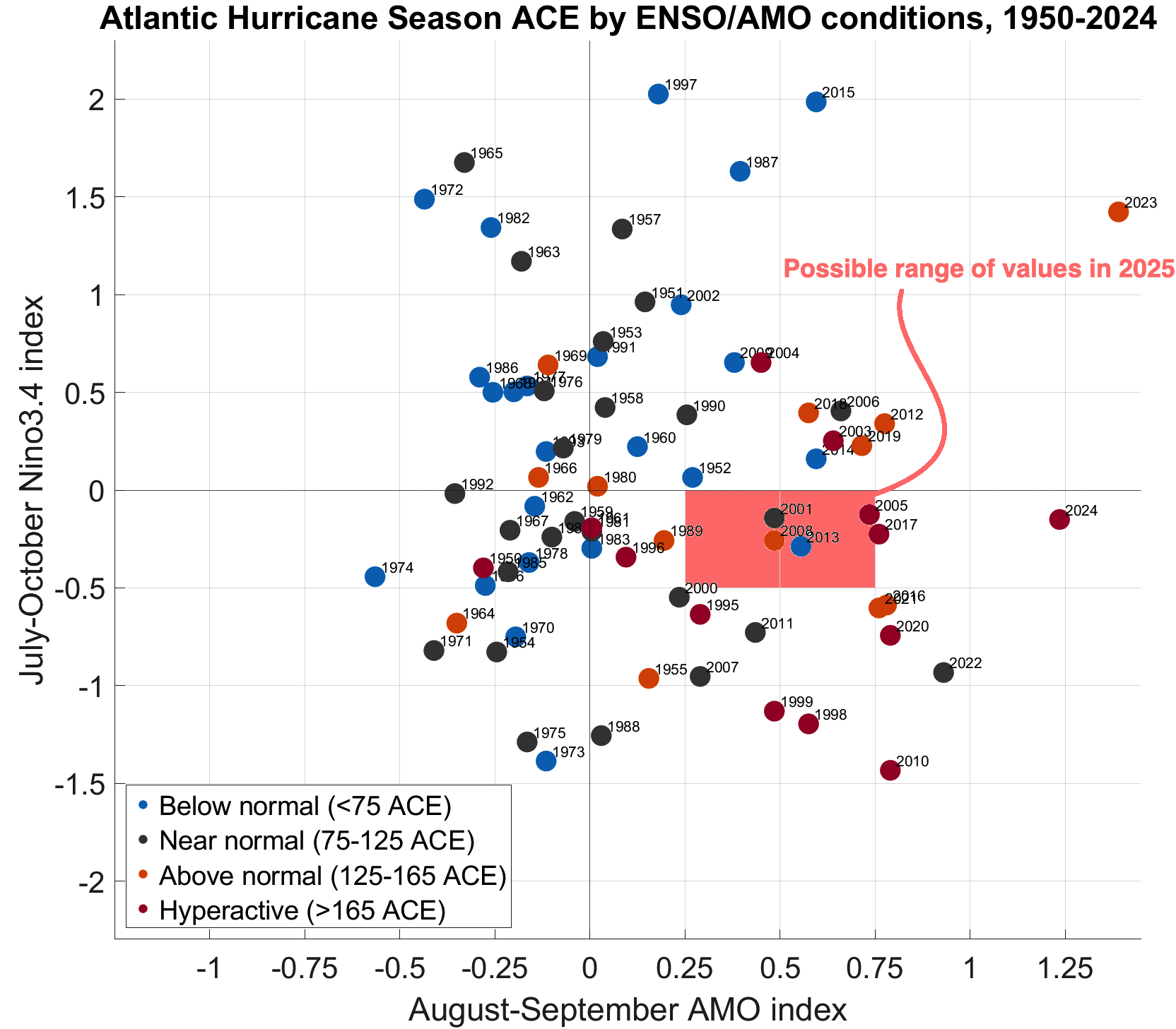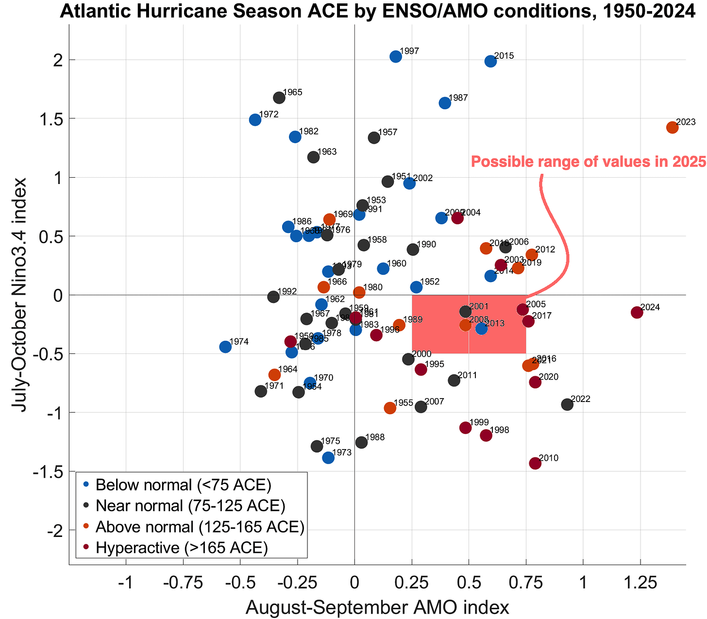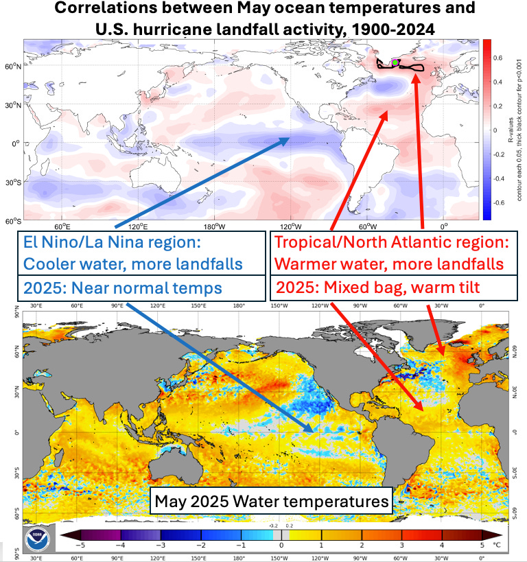 That’s because landfall risks are predicated on not just how many hurricanes form, but where they develop, and how they move and intensify. (Frankly, there’s a lot of pure chance at play too, so predicting a season’s overall landfall risks has a very large uncertainty estimate.) If the eastern Tropical Atlantic is too warm, many of those additional storms can wind up tracking into the open ocean, or being preferentially steered east of the continental U.S. As shown above, that’s why hyperactive seasons in terms of overall activity are most common when a La Nina and warm Tropical Atlantic overlap, but high U.S. landfall years occur across a wider range of sea surface temperature configurations, especially on the Atlantic side.