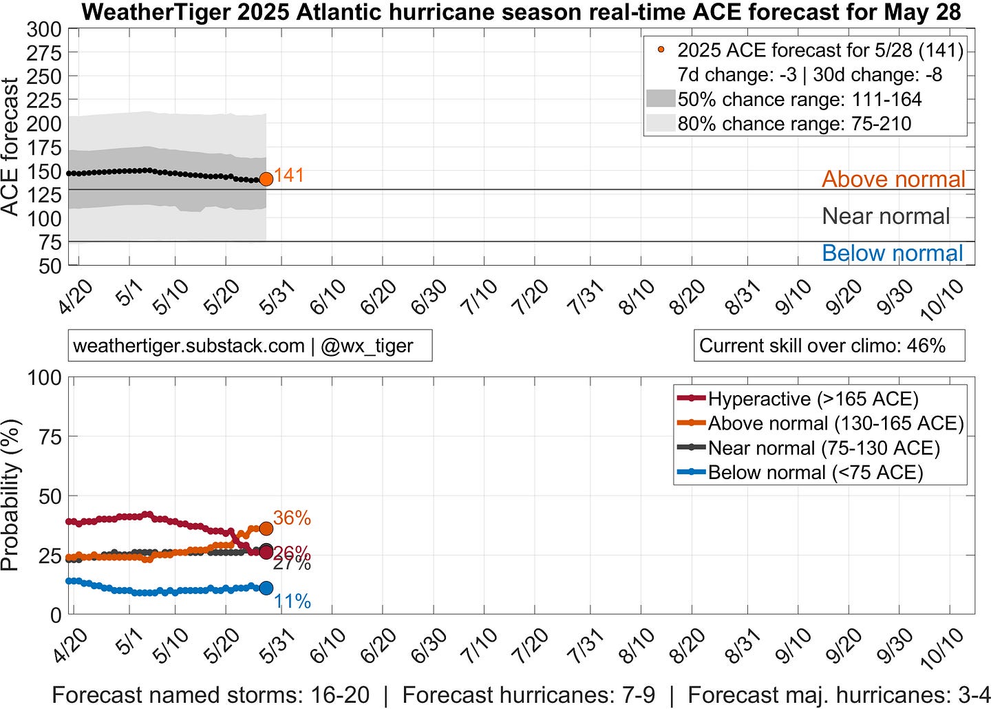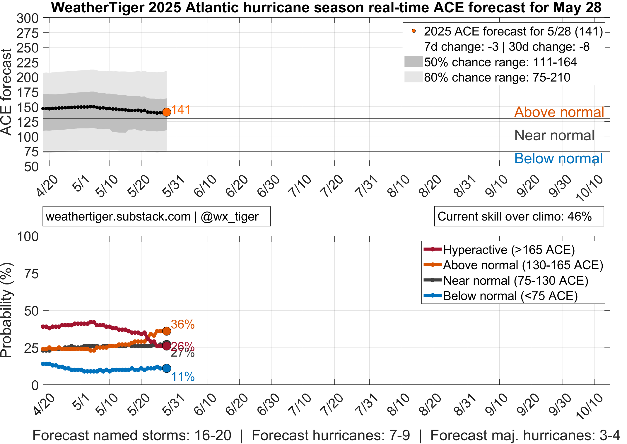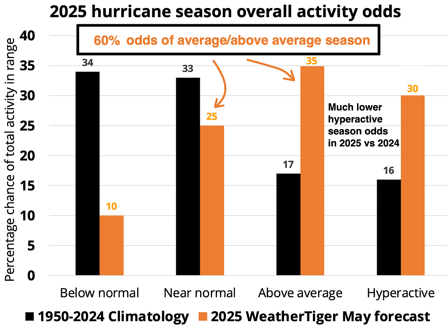 As another bit of orientation, WeatherTiger’s seasonal outlook is different than others because I’m going to spend minimal time talking about how much activity will happen in the Atlantic Basin as a whole. The reason for that is simple: you don’t live in a mid-ocean shipping lane, geothermal vent, or micronation, so overall activity forecasts tell you little about your hurricane season to come. For what it’s worth, we see about 65% odds of an above normal season, with 2025 more likely than not to tally 16 to 20 tropical storms, 7 to 9 hurricanes, 3 to 4 major hurricanes, and an Accumulated Cyclone Energy (ACE) outcome of ~140 units, trending down slightly in the last two months. You can follow daily updates to our seasonal forecast model here.