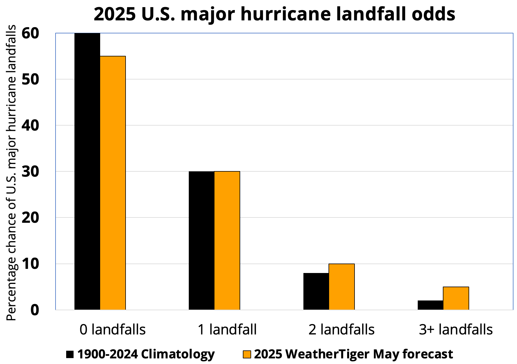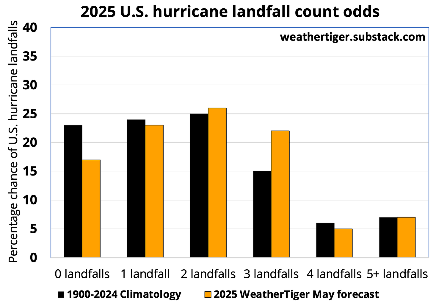 All told, WeatherTiger’s targeted seasonal model for U.S. hurricane strikes is projecting about 5 units of ACE happening over the continental U.S. in 2025, versus a typical 4.0 to 4.5 U.S. ACE units in a season. That corresponds to an 80 to 85% chance of at least one U.S. hurricane landfall and about 1-in-3 odds of three or more, with a 45 to 50% probability of at least one U.S. major hurricane landfall in 2025. Those risks are all slightly above normal, but again, take these probabilities as the uncertain estimates they are. For what it’s worth, there’s only about a 1-in-15 chance of 2025 equaling or exceeding last year’s five U.S. hurricane landfalls. U.S. landfall odds also update each day between now and October at our real-time seasonal modeling page.