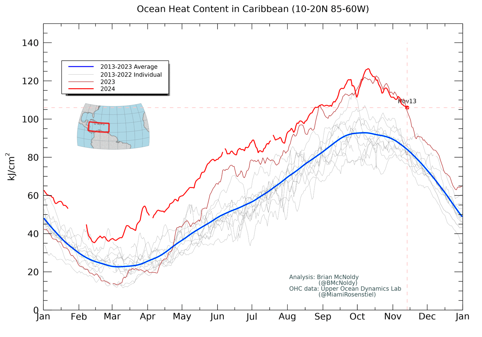 There are two key implications to the lack of decent fronts during this AWOL fall. First, the seasonal cooling of the Gulf and Caribbean has been arrested. Total oceanic heat content of the Gulf has slightly increased in the last three weeks, hovering around mid-October norms; the heat content of the Caribbean remains well above what it would typically be at the peak of the season in mid-September. There’s plenty of fuel available to sustain a hurricane, if atmospheric conditions allow.