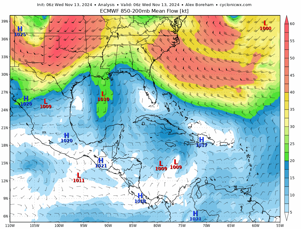 The real uncertainty in the forecast comes over the weekend, when the system will be stuck between a dip in the jet stream over the western Atlantic and a ridge to its northwest, and thus moving slowly near Central America. If the center of the low can avoid moving over land, upper-level winds are very favorable for intensification, and a strong hurricane would probably result. However, the center will more likely than not nudge southward into Honduras on Saturday or Sunday, thanks to the powerful ridging along the Gulf Coast, which would keep intensity in check. This could go either way, and what happens this weekend will make a big difference to eventual Florida impacts, so stay tuned.