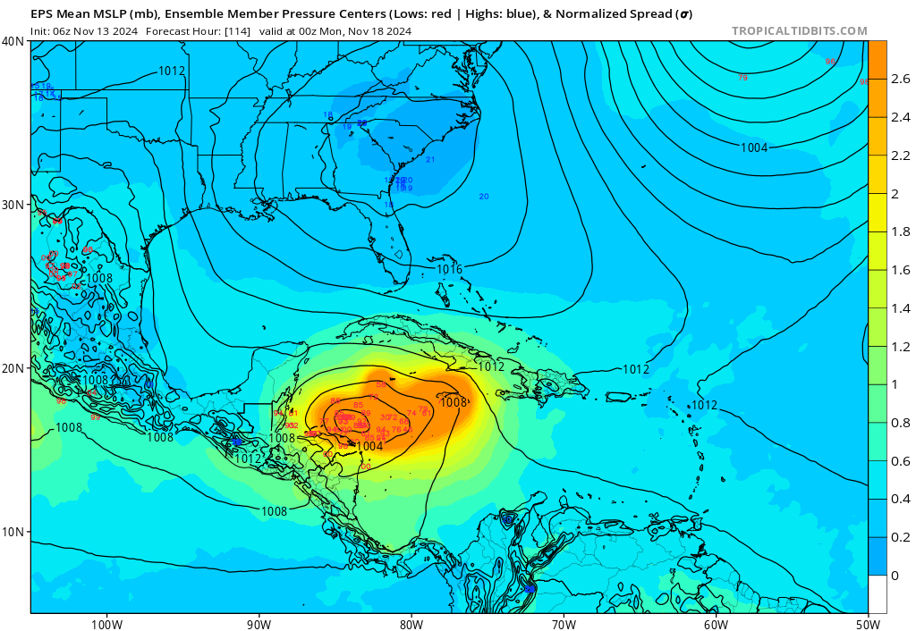 Early next week, models are in good agreement that the Gulf ridging will slide east as the first respectable cold front since mid-October pushes into the Mississippi Valley. This means whatever is milling about Central America or the western Caribbean at that time, be it a formidable hurricane or a sloppy gyre low, will move northwest and north into the southern Gulf. The center could cross the Yucatan peninsula on Monday or Tuesday as this turn occurs, an important consideration as continued favorable environmental conditions mean land interaction is the only real e-brake to intensification through Tuesday. That would come at a cost, as slow motion over land will trigger serious, life-threatening flooding in Central America.
