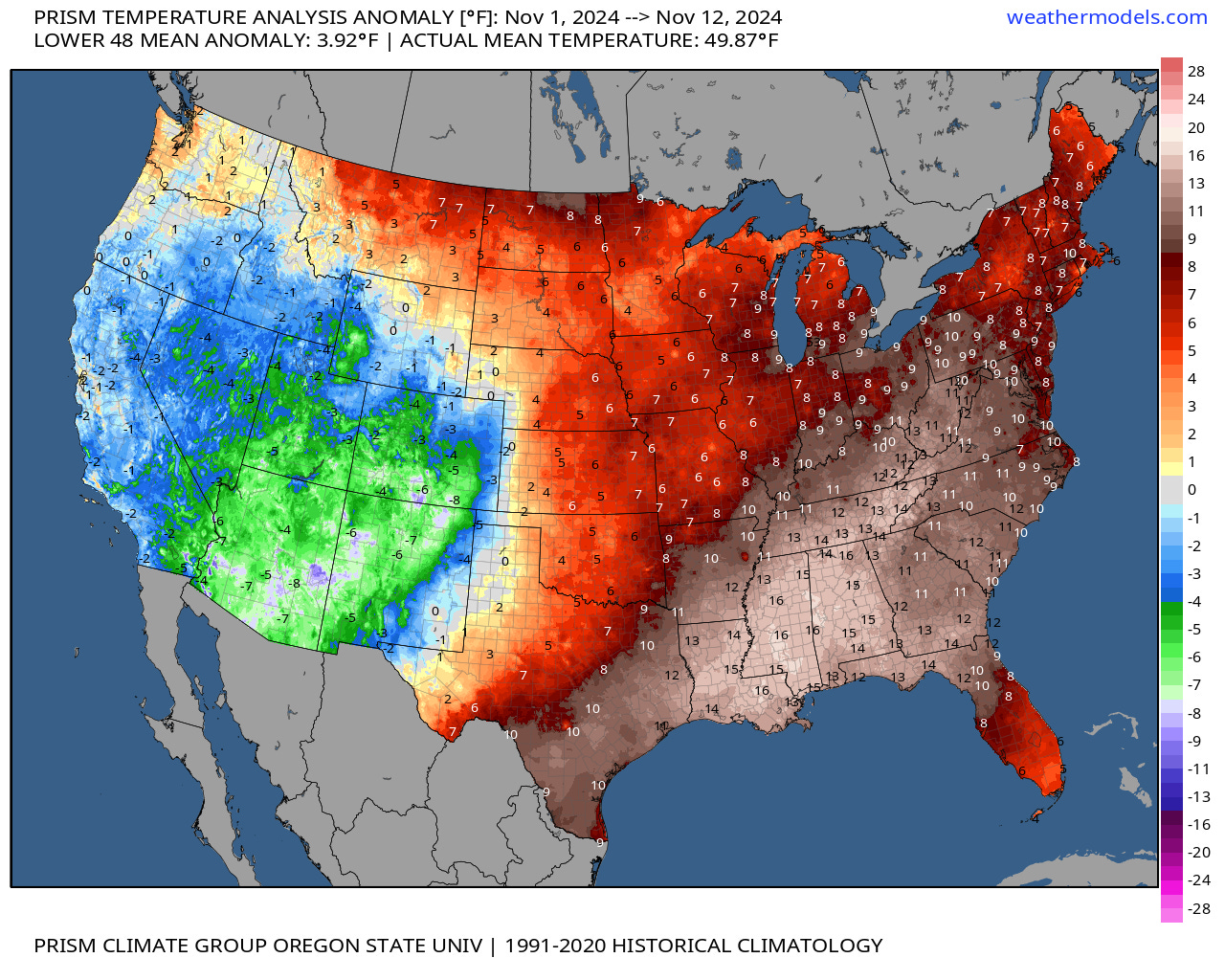 However, November hurricane history really isn’t the right frame of reference, as weather patterns over the past three weeks have more in common with typical conditions in late September or early October. Temperatures to start off the month are averaging 5 degrees above normal in Miami, 10 degrees above normal in Tampa, and a whopping 15 degrees above normal in Tallahassee and elsewhere across the Deep South, coupled with minimal rainfall.