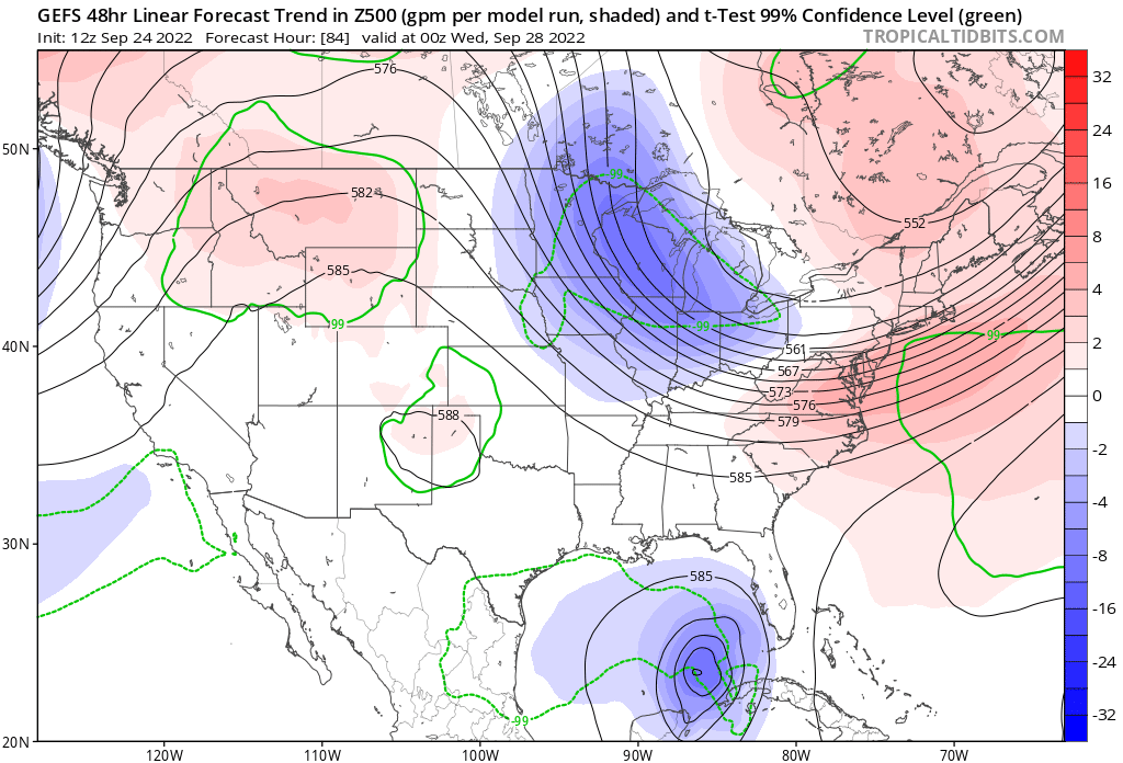 Friday’s NHC forecast tracks had a most probable strike in this region; while there have been adjustments north and west since, the uncertainty in Ian’s initial position and the evolution of the steering pattern mean that Southwest Florida is not out of the woods. This is particularly true as while Ian’s intensity may crest on Tuesday, major hurricane strength is still favored to persist into Wednesday. Central Florida and the Space Coast, this general scenario includes a Charley-type track, so watch for trends stronger with the troughing as a sign of danger.